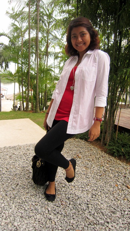 Topshop white shirt, Dorothy Perkins red top and leggings, Juicy Couture handbag, Cotton On flats, Guess watch and Diva ring and necklace.